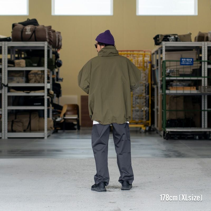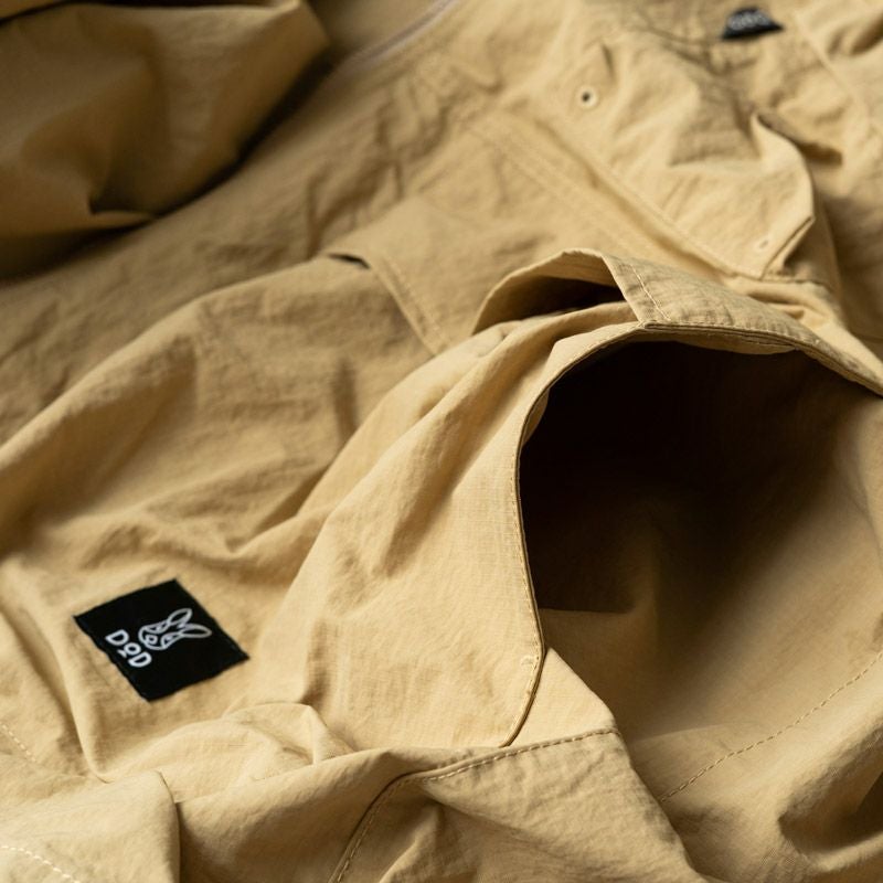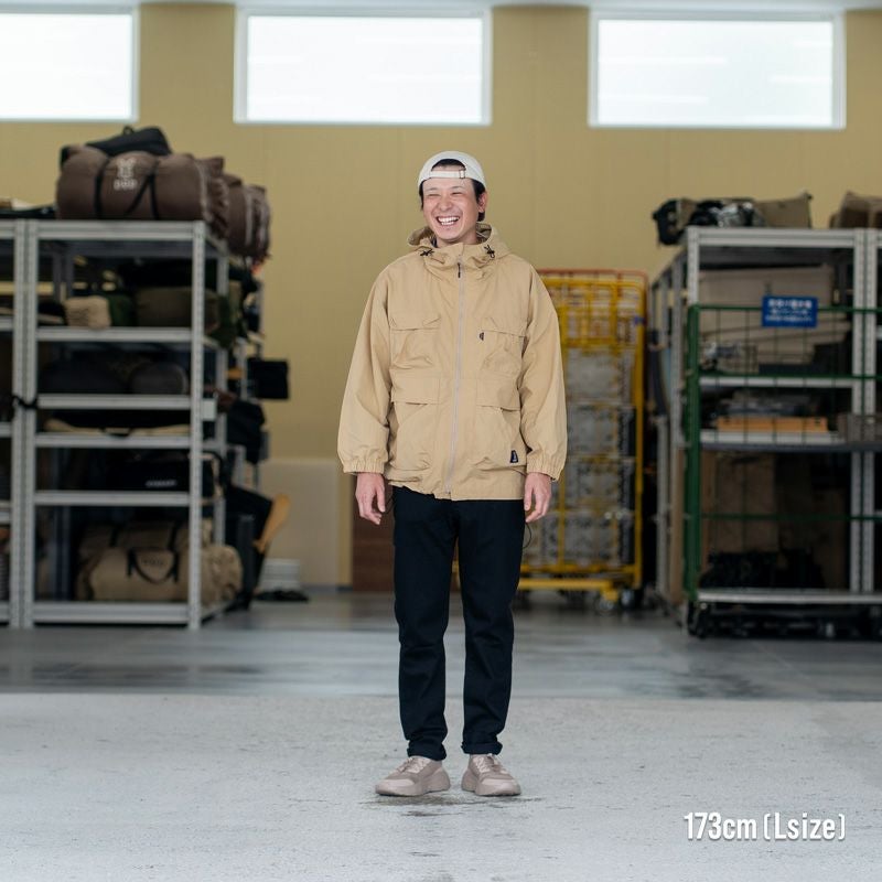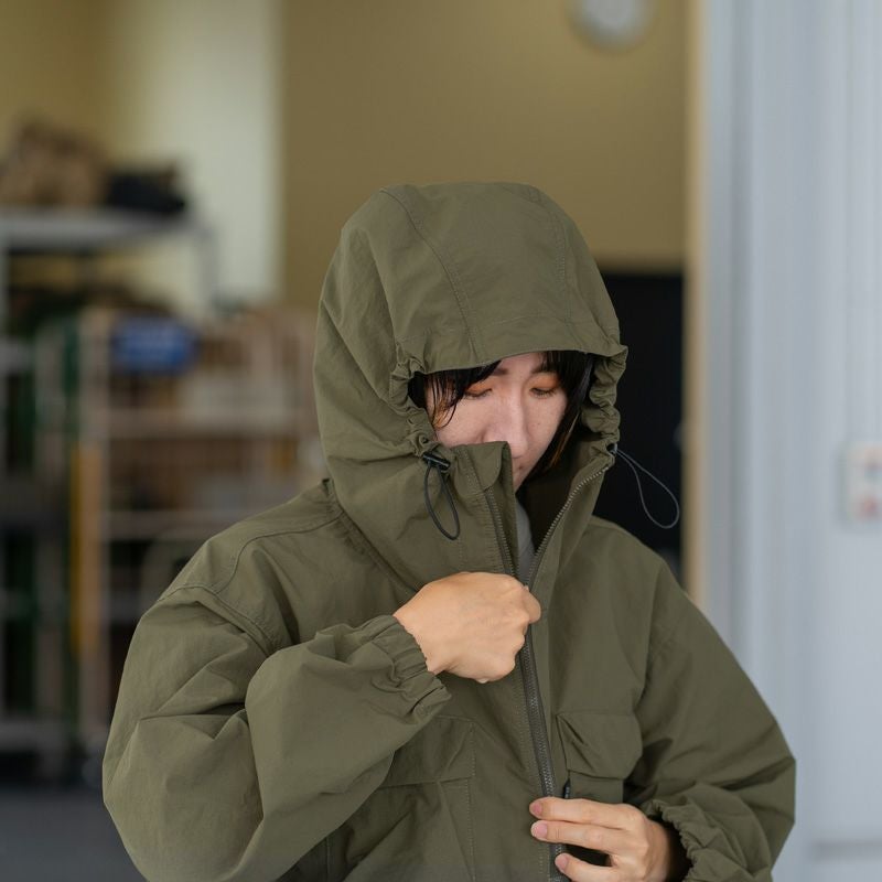 撥水加工が施されているのでちょっとした雨であればフードをかぶってしのげます。 まだキャンプでは使用していませんが、ポケットがたくさんあり一つ一つが大きめなので、アウトドアでもかなり便利そうだと感じています。もちろん日常使いでも使いやすく、さっと羽織れるのが助かります。 裾のコードを絞るとシルエットが変わり、また違った雰囲気を楽しめるのも良いポイントです。